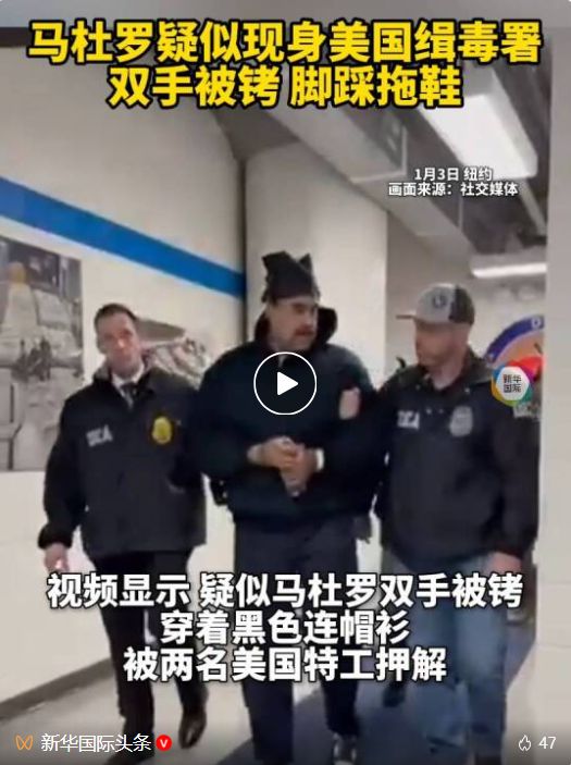 画面中迪时策略,马杜罗身穿黑色帽衫,双手被铐,脚踩拖鞋,被两名美国特工押解。马杜罗用英语对在场人员和记者说:“晚上好,新年快乐。”